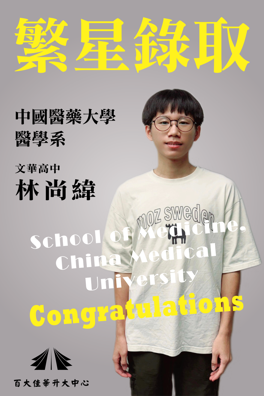 賀林尚緯同學錄取中國醫藥大學醫學系